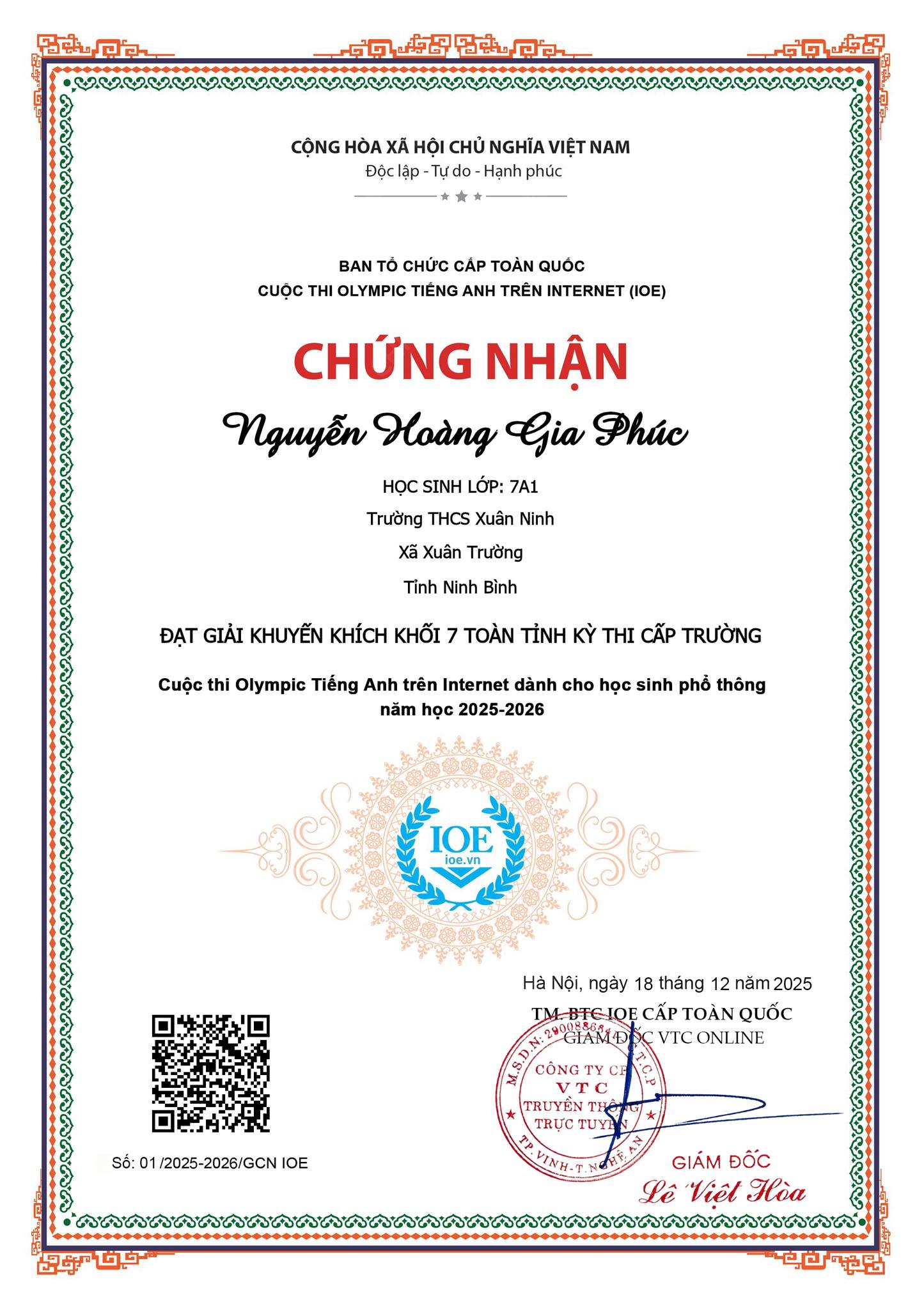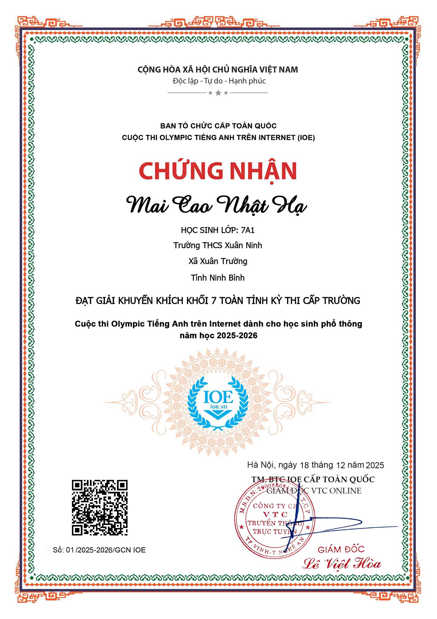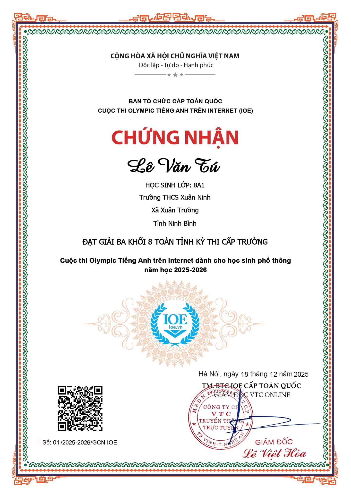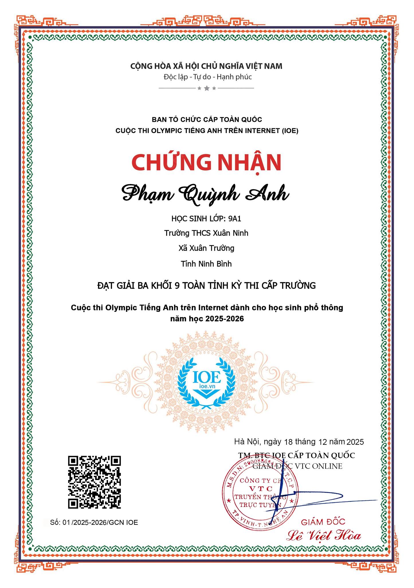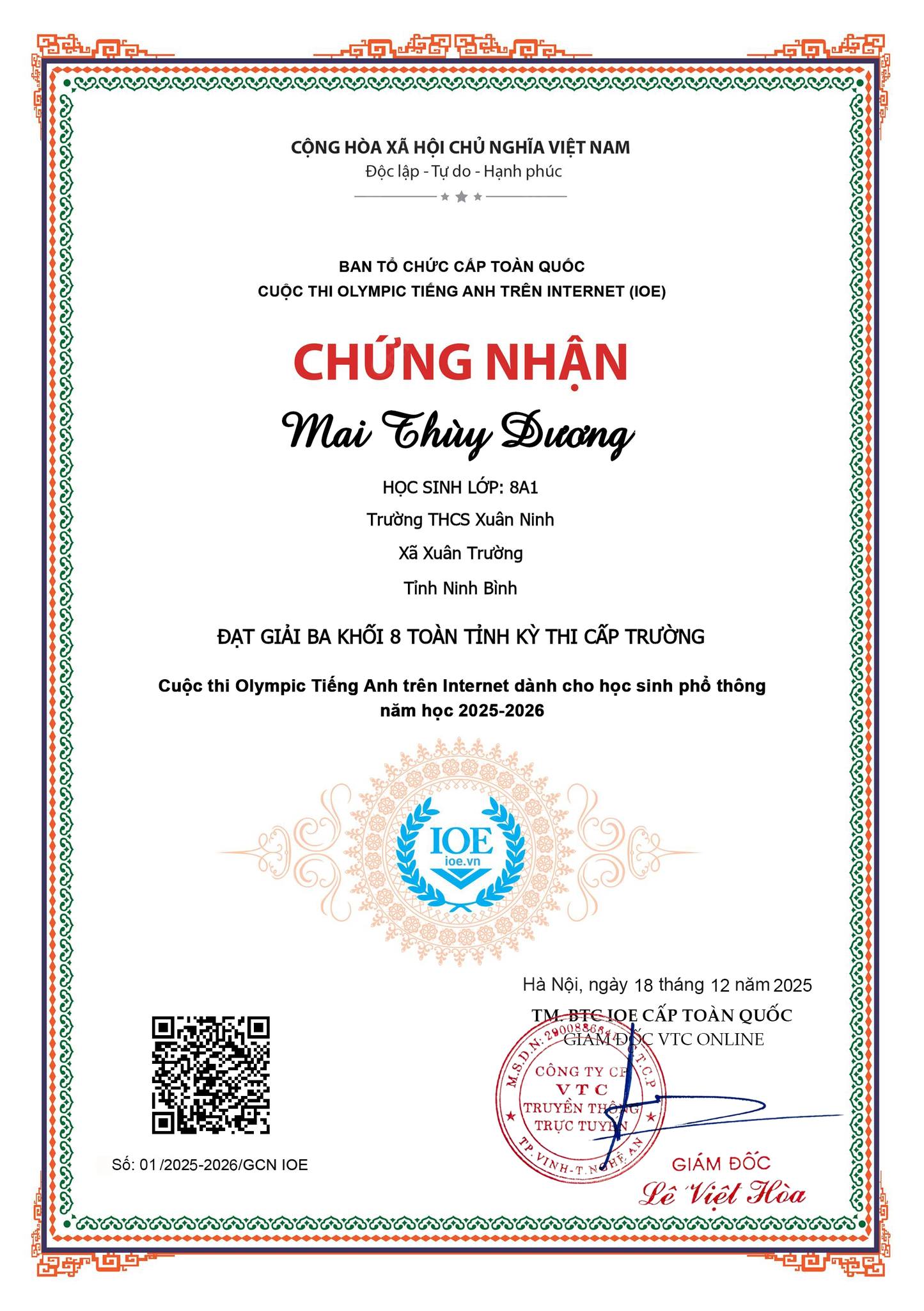 Trường THCS Xuân Ninh xin chúc mừng các em học sinh đã xuất sắc đạt giải trong Kỳ thi Olympic Tiếng Anh trên Internet (IOE) cấp trường năm học 2025-2026 được vinh danh toàn tỉnh. Thành tích này là kết quả của sự nỗ lực bền bỉ, tinh thần ham học hỏi của các em; đồng thời là minh chứng cho sự tận tâm, nhiệt huyết của các thầy cô giáo trong công tác bồi dưỡng học sinh giỏi. Nhà trường tin tưởng rằng, với niềm đam mê và quyết tâm ấy, các em sẽ tiếp tục gặt hái thêm nhiều thành công trên con đường học tập, góp phần lan tỏa tinh thần học tốt môn Tiếng Anh đến toàn thể học sinh trong trường. Một lần nữa, xin nhiệt liệt biểu dương và chúc mừng các em học sinh cùng các thầy cô giáo hướng dẫn! Chúc các em luôn tự tin, bản lĩnh và tiếp tục tỏa sáng trong những chặng đường tiếp theo.